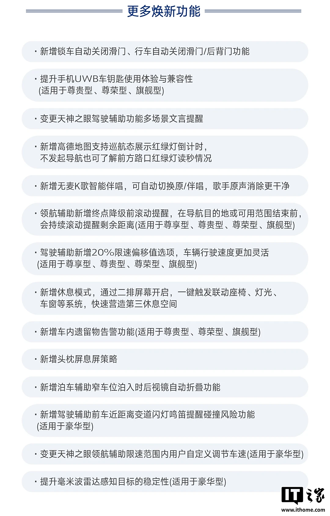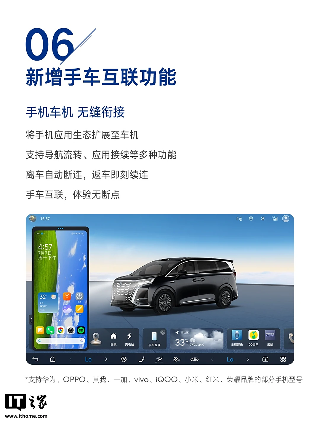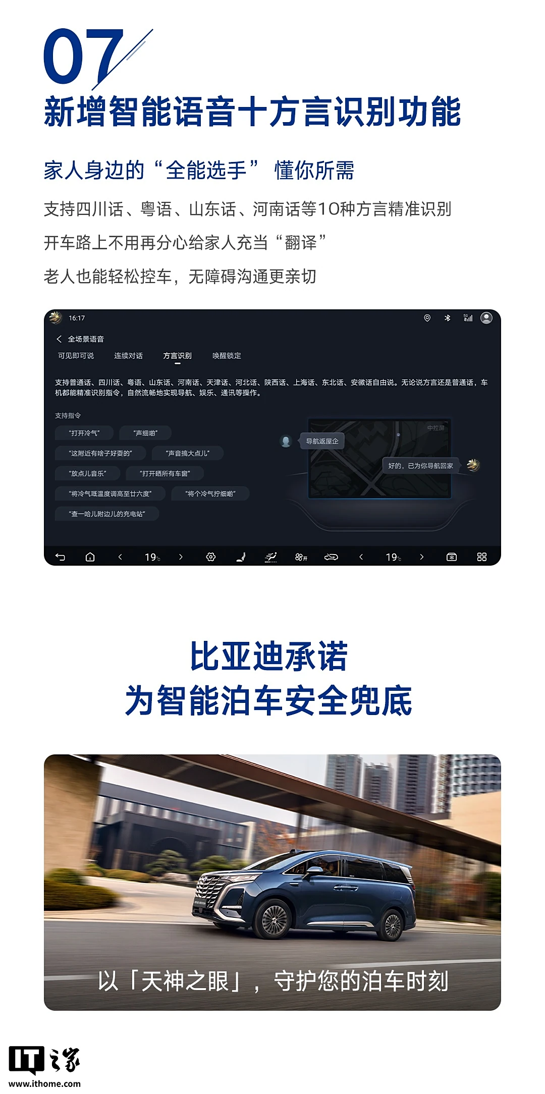 除了辅助驾驶,此次 OTA 还新增了手车互联功能,支持导航流转、应用接续等多种功能,实现手机、车机的无缝衔接。更贴心的是,新加入的智能语音十方言识别功能,能够精准识别包括四川话、粤语、山东话、河南话在内的十种方言,让用户可以用熟悉的乡音与车辆互动。