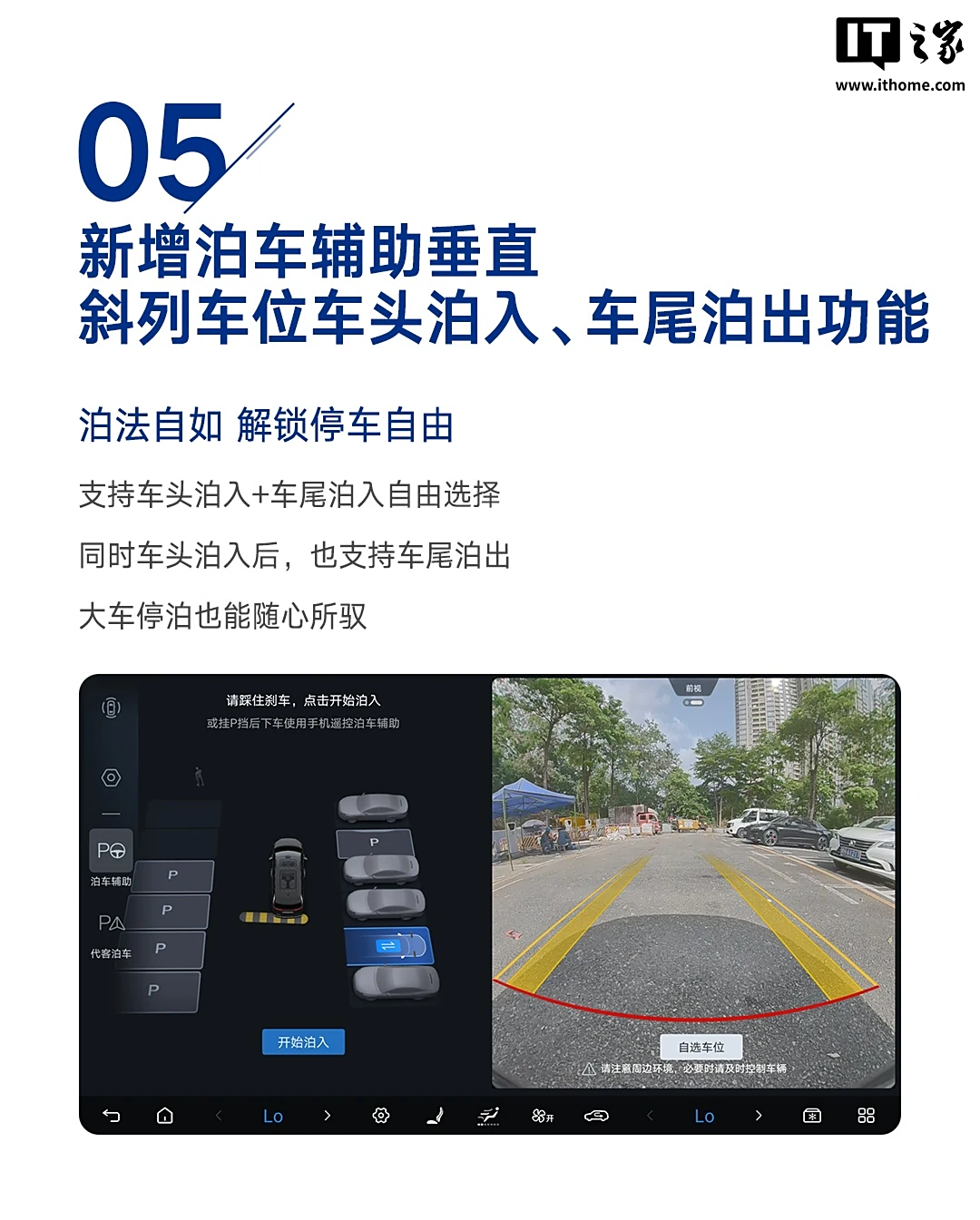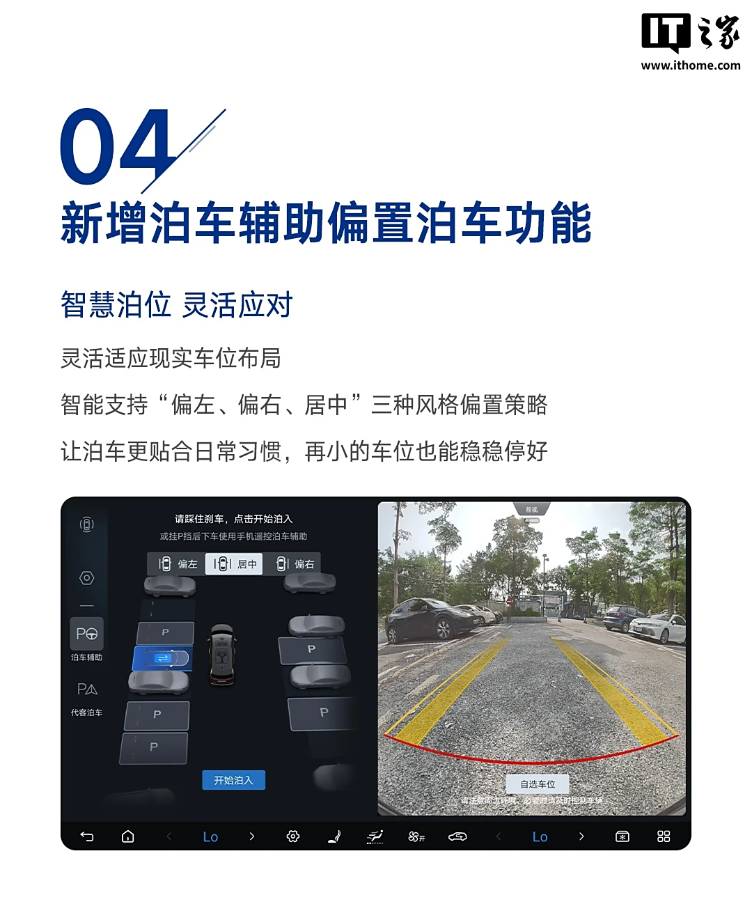 此次 OTA 在泊车辅助方面也带来了多项全新功能。遇到车位有车辆或障碍物越线时,泊车辅助偏置泊车功能智能支持偏左 / 偏右 / 居中三种风格偏置策略。新增的泊车辅助垂直 / 斜列车位车头泊入、车尾泊出功能让泊车更加随心所欲,新手也能轻松应对。