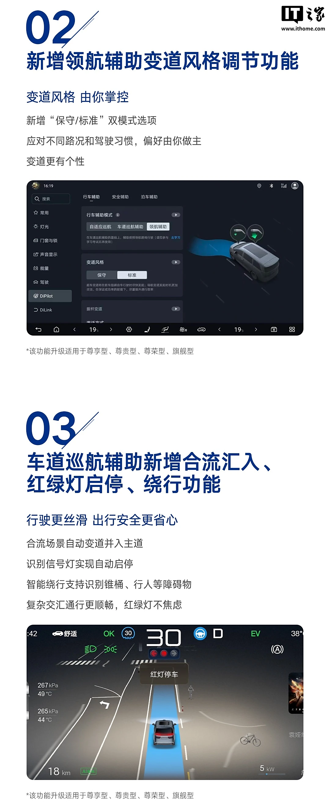 25 款腾势 D9 此次 OTA 新增的领航辅助通行效率优先功能,能够根据车流速度自动调节车速,让出行更加高效省心。新增的领航辅助变道风格调节功能,提供“保守 / 标准”双模式选项,满足不同用户的驾驶风格和习惯,让变道更高效安全。在车流大、车速快的汇入口,车道巡航辅助新增合流汇入、红绿灯启停、绕行功能,精准识别路况,在合流场景自动变道并入主道,还能识别信号灯实现自动启停,让驾驶更轻松。遇到锥桶、行人等障碍物智能绕行,确保驾驶的安全与顺畅。