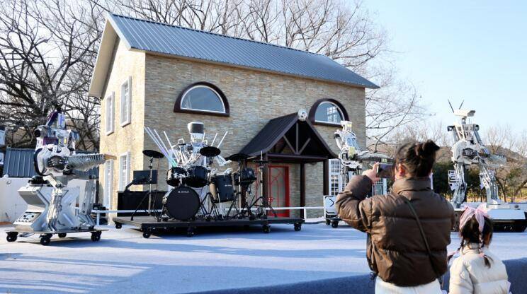 随着舞台灯光亮起,磐石机器人乐队的金属身影整齐亮相,瞬间吸引全场目光。没有真人指挥,键盘手灵活“按动”琴键,吉他手精准拨动琴弦,鼓手随着节奏有力敲击鼓面,贝斯手的旋律沉稳铺垫,一系列高难度演奏动作行云流水,《光辉岁月》《飞得更高》等经典曲目轮番奏响,金属机械的精准与音乐艺术的柔美完美融合,现场掌声、欢呼声此起彼伏。不少游客举起手机定格这一奇妙瞬间,感慨“在古村落里听机器人演奏,浪漫又新奇,这绝对是最特别的元旦记忆!”