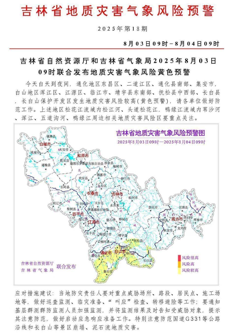 今天白天到夜间,通化地区东昌区、二道江区、通化县南部、集安市,白山地区浑江区、江源区、临江市、靖宇县东南部、抚松县中西部、长白县,长白山保护开发区发生地质灾害风险较高(黄色预警),请做好防范工作。上述地区松花江流域内松江河、头道松花江,鸭绿江流域内苇沙河、浑江、五道沟河、鸭绿江周边相关地质灾害风险区要重点关注。